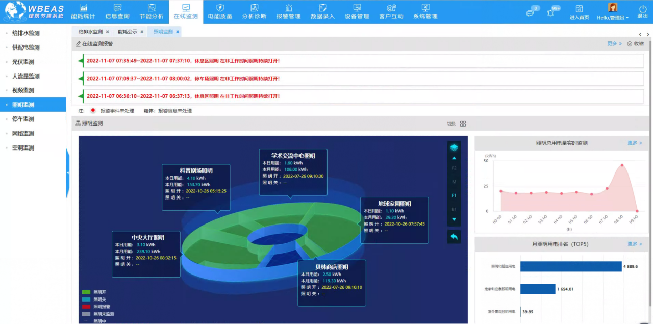 襄陽科技館新館使用了節(jié)能型LED燈具,節(jié)能效果顯著,智慧照明系統(tǒng)實現(xiàn)了公共區(qū)域照明的集中控制,但重要區(qū)域照明控制仍然依靠人工控制,無法做到根據(jù)實際需要開啟不同照明燈具,針對該情況,智能優(yōu)化節(jié)能系統(tǒng)將重點區(qū)域照明納入統(tǒng)計管理,根據(jù)實際區(qū)域使用情況,對照明進行智能化控制,減少無人情況下,照明用電的浪費,通過加強對非工作時段照明的管控,預(yù)計一年可節(jié)約電費2.5萬元。