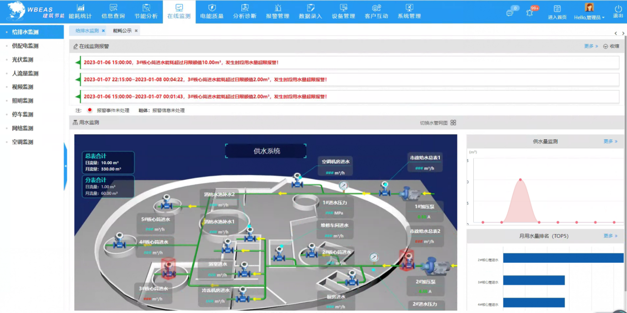 襄陽科技館展區(qū)多,建筑能源管網(wǎng)復(fù)雜,能源跑冒滴漏不易被及時發(fā)現(xiàn),導(dǎo)致能源長期被浪費,WBEAS節(jié)能系統(tǒng)將科技館內(nèi)部供水管網(wǎng)、制冷管網(wǎng)以能流圖的形式顯示用能走向,方便運維人員查看能源流向以及各級損耗情況,通過能源平衡報警,運維人員及時處理了多處地下供水管網(wǎng)跑冒滴漏的情況,避免用能浪費,預(yù)計一年可節(jié)約電費3萬元。