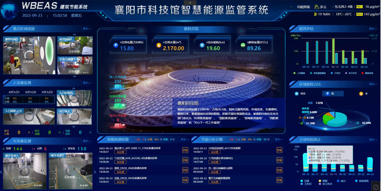 襄陽市科技館新館總建筑面積35268㎡,其中地上建筑面積26468㎡,地下建筑面積8800㎡,展教面積約20000㎡,屬國家特大型科技場館。為響應(yīng)國家和省節(jié)能主管部門有關(guān)公共建筑機構(gòu)節(jié)能管理的精神,提高襄陽科技館能源管理信息化水平,經(jīng)公開招標,引進萬洲電氣WBEAS建筑智能優(yōu)化節(jié)能系統(tǒng),該項目于2022年3月初開始建設(shè),5月底完成系統(tǒng)上線運行和驗收。
