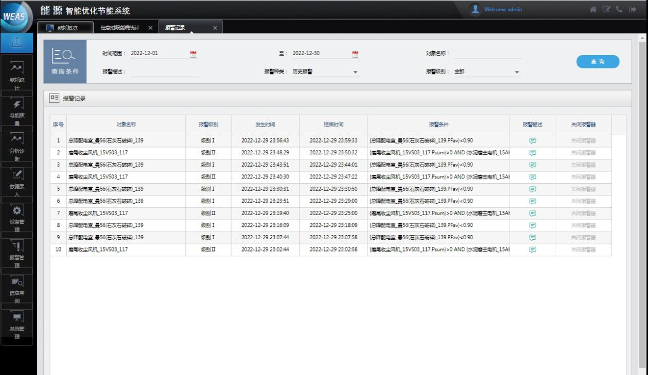 4、水泥磨、收塵風(fēng)機(jī)聯(lián)鎖控制節(jié)能。現(xiàn)場水泥磨工段的水泥磨主電機(jī)與收塵風(fēng)機(jī)屬于相互聯(lián)鎖設(shè)備,收塵風(fēng)機(jī)作為水泥磨主電機(jī)的輔機(jī)設(shè)備,在主機(jī)停機(jī)后應(yīng)該及時(shí)關(guān)閉,通過系統(tǒng)的報(bào)警功能發(fā)現(xiàn),現(xiàn)場水泥磨主電機(jī)停機(jī)后,收塵風(fēng)機(jī)存在關(guān)閉不及時(shí)的情況,持續(xù)以100kW的功率運(yùn)行,用戶在通過系統(tǒng)發(fā)現(xiàn)問題后對水泥磨與收塵風(fēng)機(jī)的聯(lián)鎖進(jìn)行了管控,每年節(jié)約電費(fèi)4萬元。