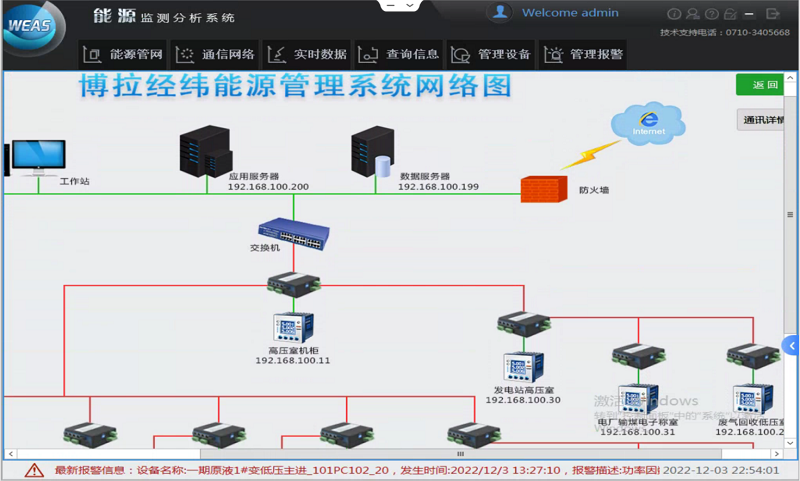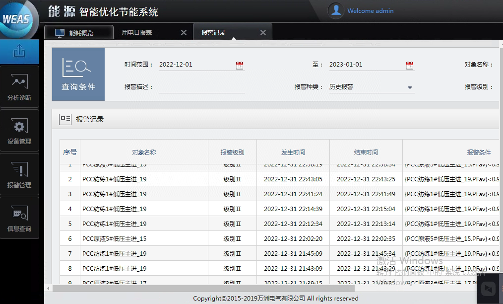 主要是對設置的報警信息進行集中管理,并針對報警信息進行匯總統計分析,分析經常出現問題的故障點、故障次數等,自動生成設備異常管理綜合報告。使用報警功能可以對重要的用能設備(低壓進線、水泵等)設置用能參數預警,以幫助用能管理者更好的管理和維護重點用能設備,一方面控制主要用能設備的能耗,另一方面關注關鍵生產設備的運行狀態,避免設備故障造成生產的影響。
