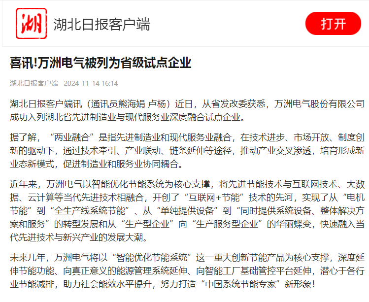 湖北日報客戶端訊(通訊員熊海娟 盧楊)近日,從省發改委獲悉,萬洲電氣股份有限公司成功入列湖北省先進制造業與現代服務業深度融合試點企業。