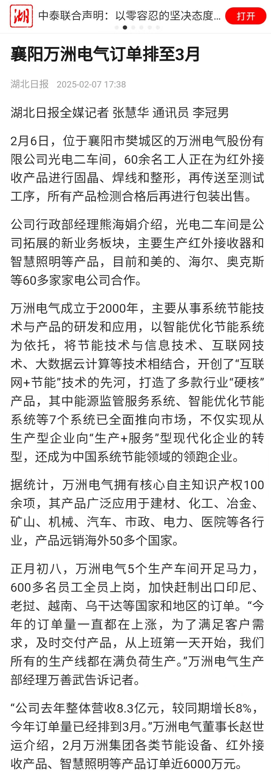 “公司去年整體營收8.3億元,較同期增長8%,今年訂單量已經排到3月。”萬洲電氣董事長趙世運介紹,2月萬洲集團各類節能設備、紅外接收產品、智慧照明等產品訂單近6000萬元。