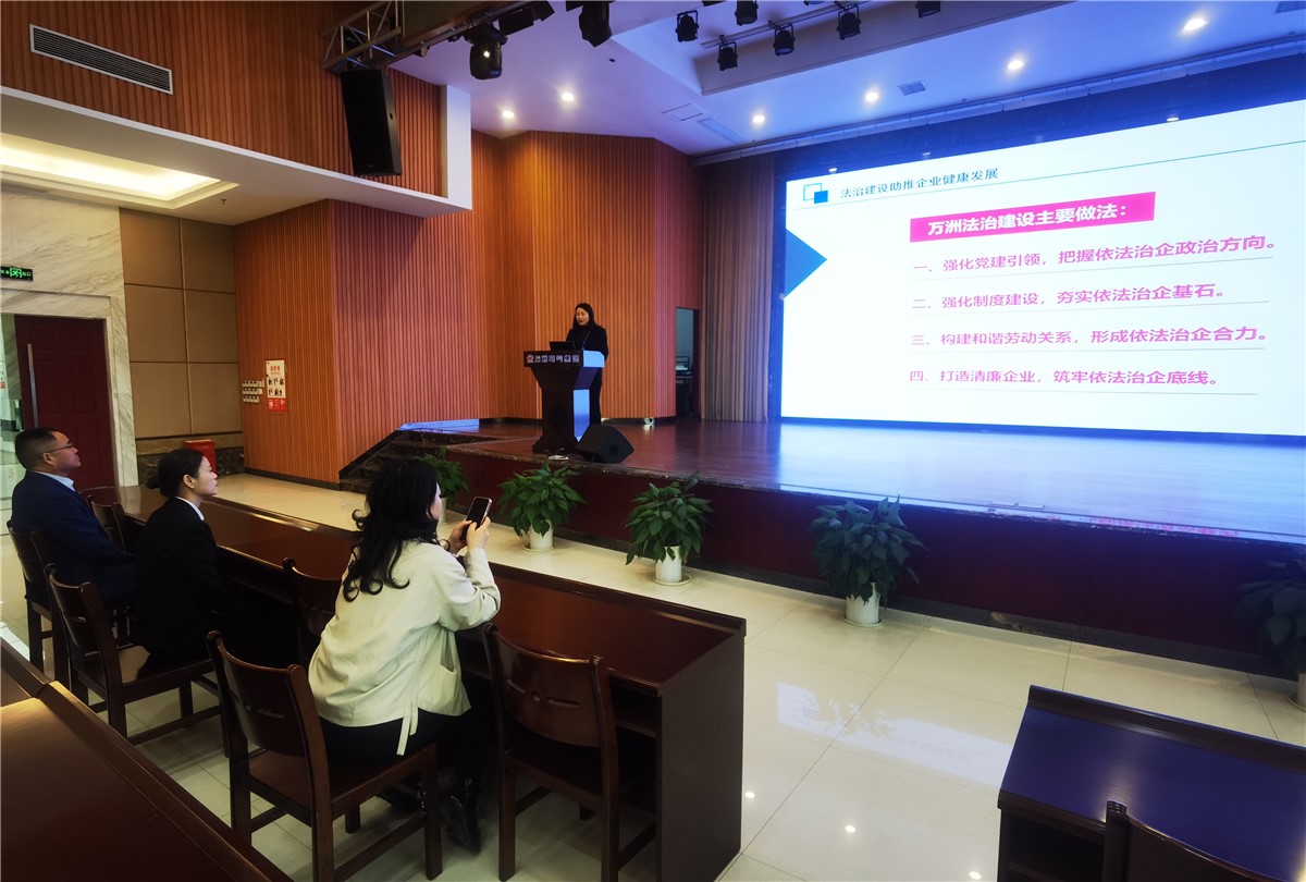 陳部長一行先后參觀了萬洲電氣文化展示廳、WOES智能優化節能系統測試試驗演示中心和法治宣傳陣地。在一樓多功能廳,萬洲電氣工會主席、行政部經理熊海娟從“強化黨建引領”、“強化制度建設”、“重視構建和諧勞動關系”、“打造清廉企業示范點”四個方面,詳細匯報了萬洲電氣“推進法治建設、助力企業發展”的具體做法。“三推、三個出來”特色黨建、“小節不保、大節必失”的廉潔自律準則、常態化開展法治宣傳教育、建立多層次民主協商機制、創建清廉企業文化等法治建設工作得到陳部長一行的高度認可,并稱贊萬洲電氣法治建設有載體、有深度、很成效,值得學習。