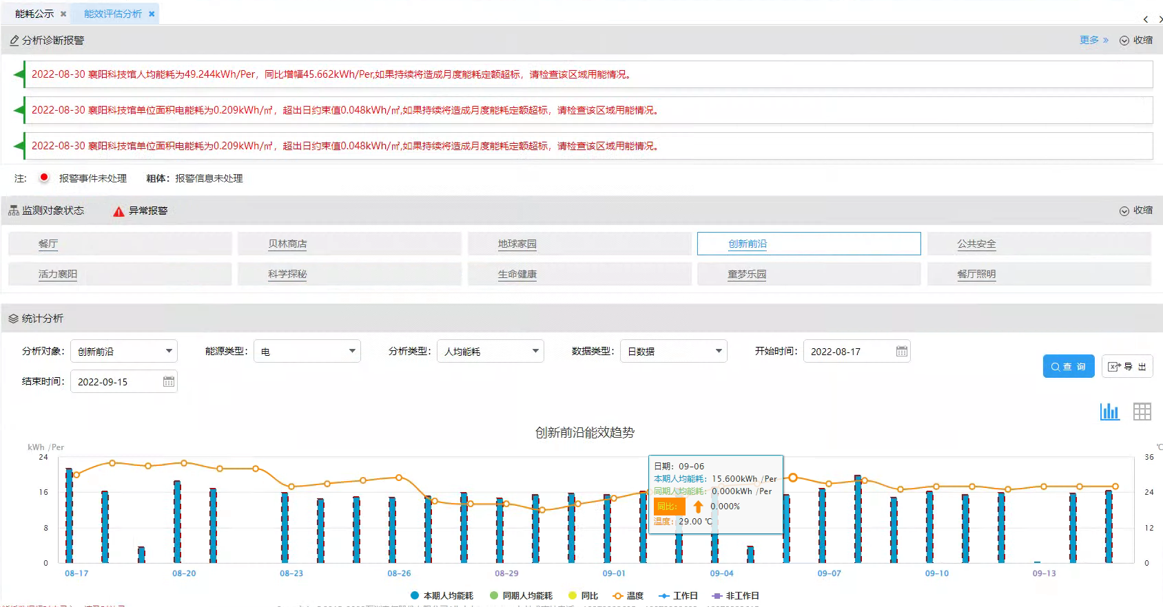 能效評(píng)估功能是對(duì)整個(gè)建筑物和重點(diǎn)區(qū)域從單位面積電耗和人均電耗兩個(gè)維度進(jìn)行能效評(píng)估,以判斷當(dāng)前能效水平是否處于最優(yōu)狀態(tài),便于指導(dǎo)物業(yè)運(yùn)維加強(qiáng)對(duì)能效指標(biāo)超限區(qū)域能耗管理。