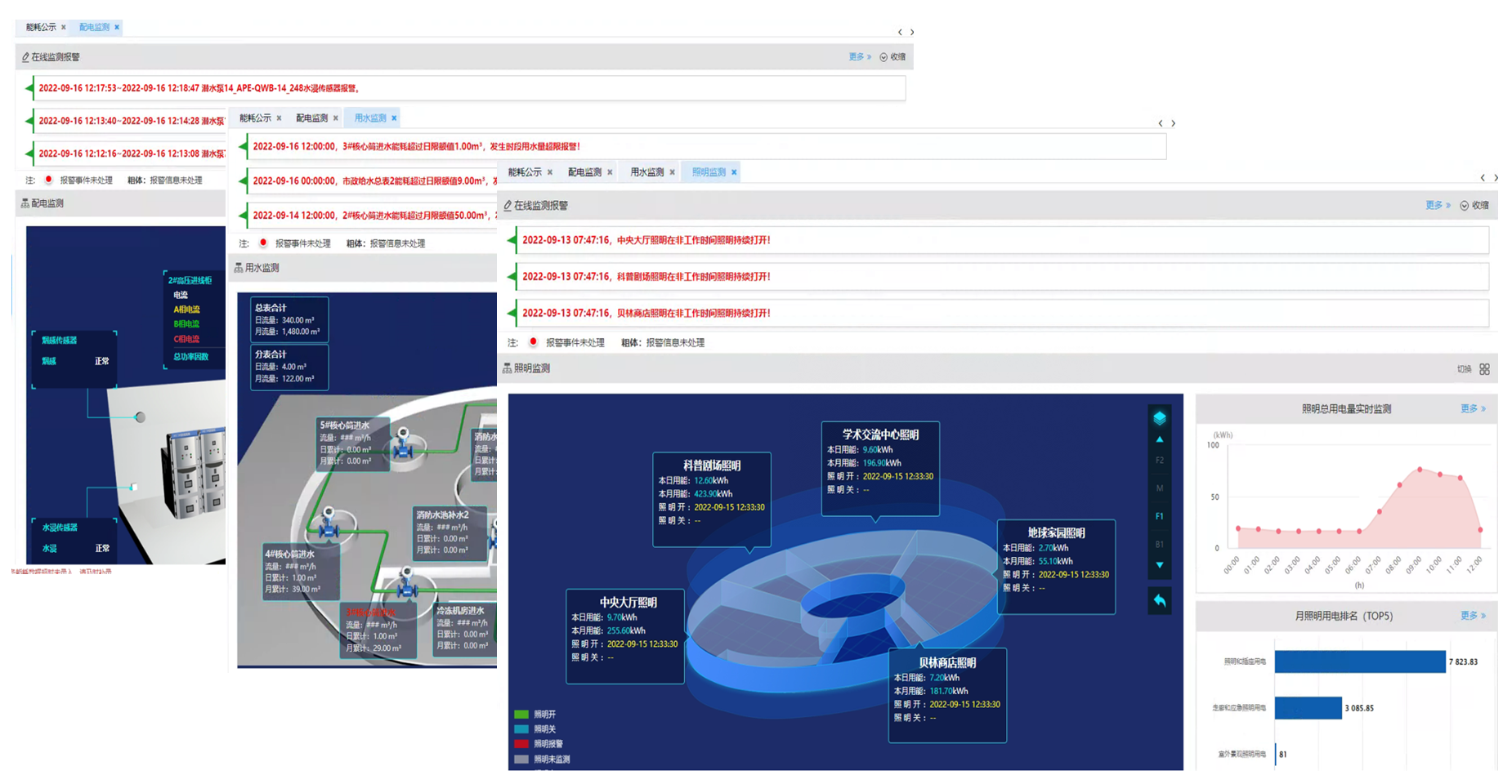 【照明監(jiān)測(cè)】照明監(jiān)測(cè)實(shí)現(xiàn)對(duì)建筑中照明分項(xiàng)各子項(xiàng)用電集中展示以及各樓層分區(qū)域用電量統(tǒng)計(jì)和開(kāi)關(guān)狀態(tài)的監(jiān)測(cè),便對(duì)建筑中能耗占比較高的照明進(jìn)行集中管理和未按照要求關(guān)閉照明燈具情況的監(jiān)管。
