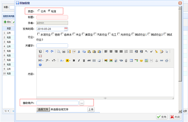 節能服務公司和企業用戶溝通的橋梁,通信的方式有兩種,第一種可以發布公共信息,即所有帳號都可以收到并查看該信息;第二種可以發送私信給某個帳號或多個帳號,只有選擇的作為接收人的帳號才能接收和查看該信息。企業信息跟蹤功能主要是為遠程平臺執守人員日常工作需要開發的功能。