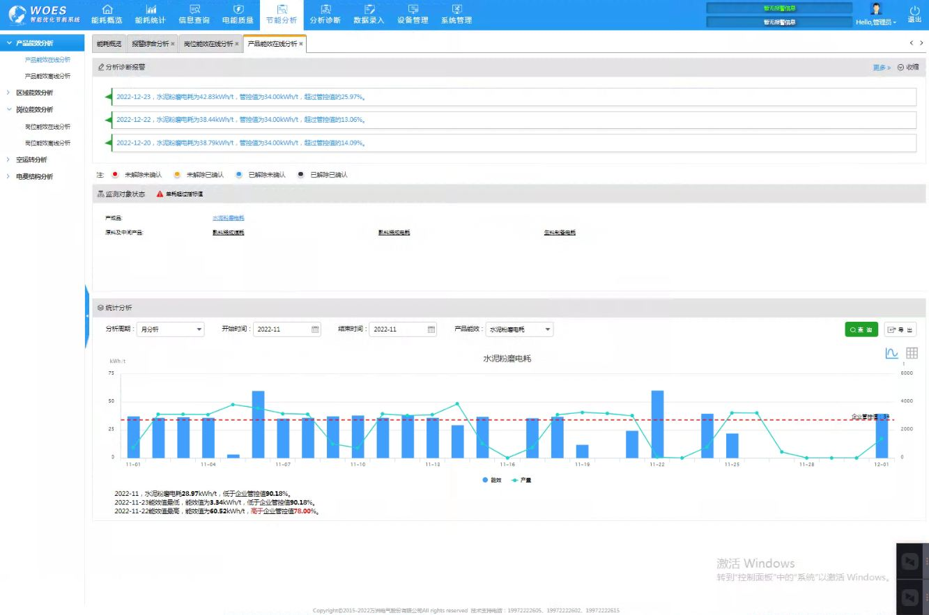 5、單耗、產(chǎn)量關(guān)聯(lián)分析節(jié)能。通過產(chǎn)品能效分析發(fā)現(xiàn)生料工區(qū)單耗存在異常情況;將能耗異常告知用戶后,并指導(dǎo)用戶通過系統(tǒng)發(fā)現(xiàn)份生料磨主電機(jī)、循環(huán)風(fēng)機(jī)電機(jī)運(yùn)行負(fù)荷均高于額定負(fù)荷的80%,且單耗均處于16.60-18.9kwh/t之間,合理調(diào)整生料磨主電機(jī)、循環(huán)風(fēng)機(jī)負(fù)荷比例,保證負(fù)荷率處于75%~80%之間,生料工區(qū)單耗控制在了16.50kwh/t以內(nèi),平均每天減少電量7500-8000kwh,按全年生產(chǎn)100天計(jì)算,每年可約電費(fèi)45萬元。