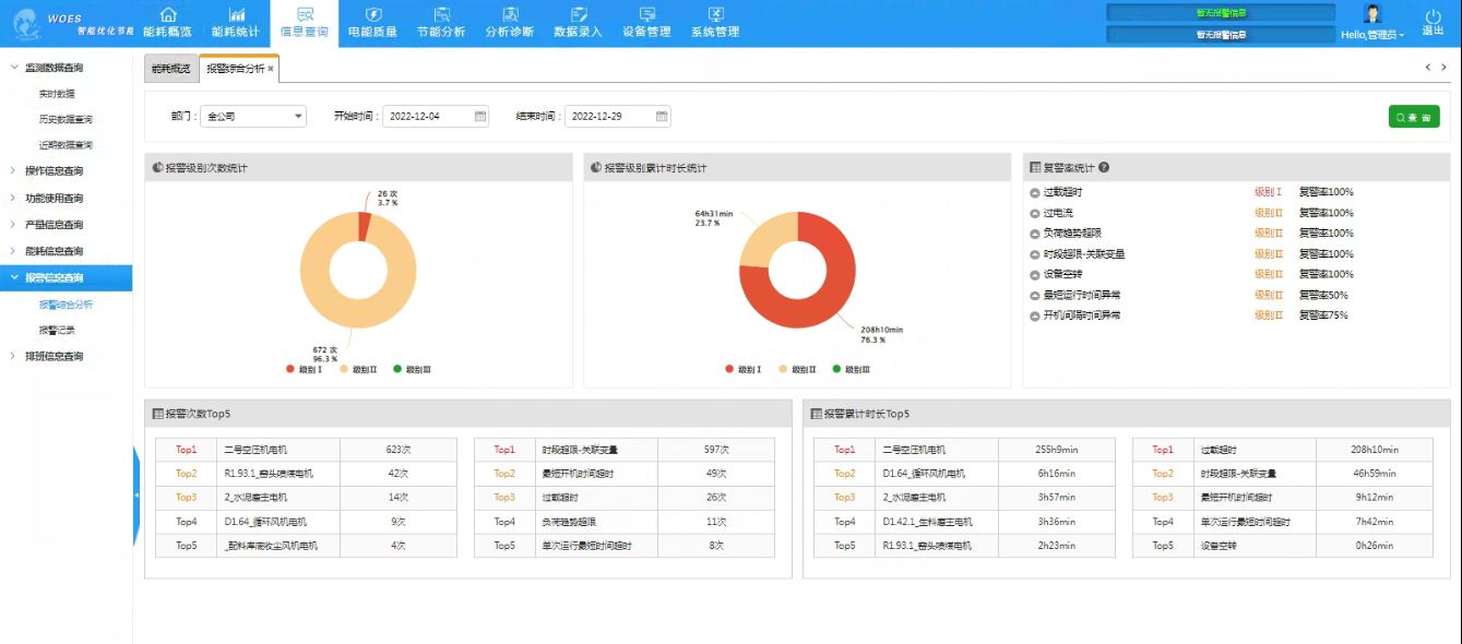 5、對(duì)水泥廠的各工段的主機(jī)設(shè)備和輔助設(shè)備之間設(shè)置關(guān)聯(lián)關(guān)系及空轉(zhuǎn)判別條件,對(duì)主機(jī)設(shè)備關(guān)停,而輔助設(shè)備沒有關(guān)停的情況進(jìn)行及時(shí)報(bào)警,并計(jì)算因此導(dǎo)致的能源浪費(fèi)量,幫助企業(yè)管理者詳細(xì)了解設(shè)備關(guān)聯(lián)運(yùn)行情況,將異常定位到具備班組,解決以前有制度但執(zhí)行不到位情況,通過報(bào)警功能提醒操作人員及時(shí)操作,減少能源浪費(fèi)。