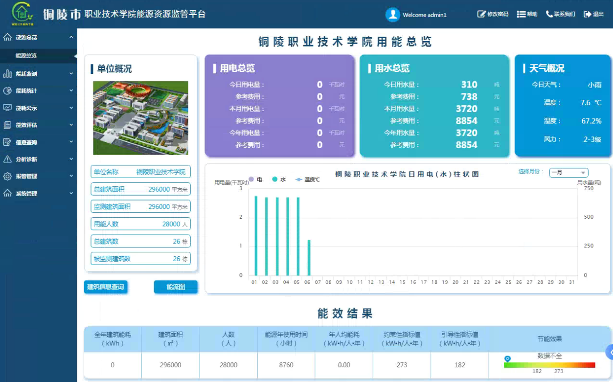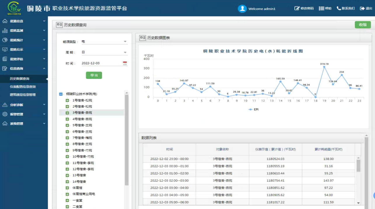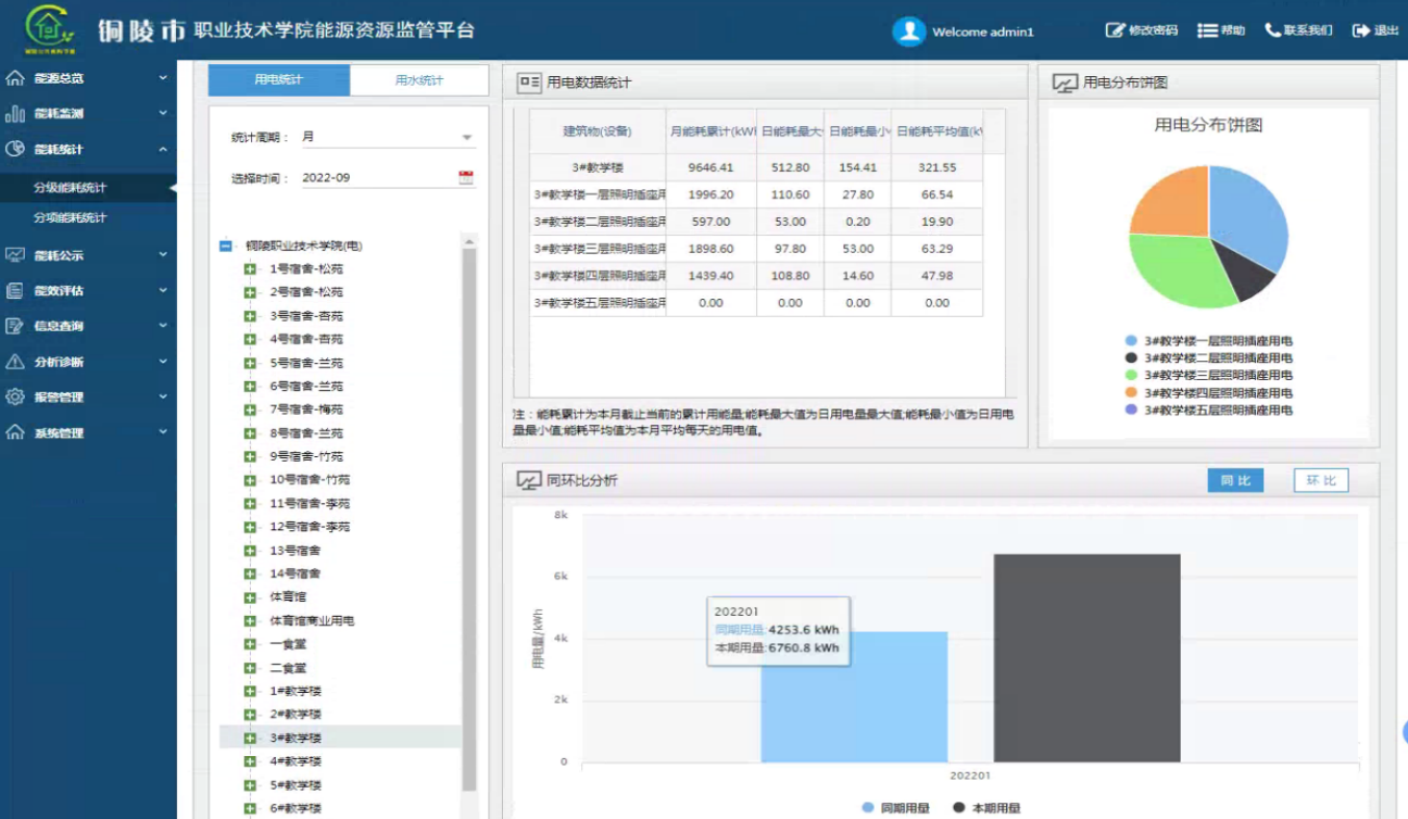 能耗統計功能主要包括分級和分項能耗統計,是實現現場各能源數據(宿舍樓、教學樓)根據用戶使用需求進行圖文展示,提升了該學院能源管理精細化、信息化程度,減少能源管理人員工作量,節約人力成本,提高工作效率和準確率。