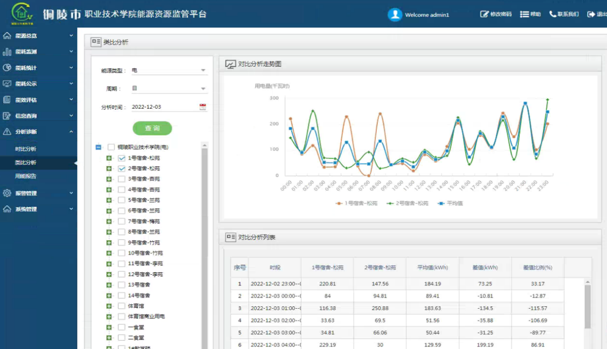 其中通過分析各監測對象(宿舍、辦公室、食堂)的運行數據的變化,發現同類用能單位不同時段的數據差異,同類用能單位之間同時段的運行參數差異,進行定量和定性的分析,包括與歷史值的對比、變化趨勢的對比等方式,通過大量的數據分析發現用能單位運行狀態的差異特征,從而判斷用能單位的經濟性變化,從而進行節能判斷。